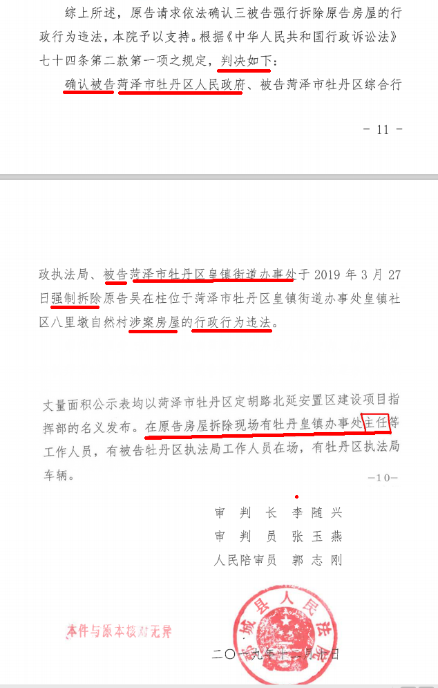 菏泽市民吴先生:官员带队强拆民房被判违法,未被追责却被评为“山东省人民满意的公务员” 近日,山东菏泽牡丹区读者吴先生向媒体反映,2019年3月,牡丹区皇镇街道办事处时任主任(现升任街道办党工委书记)穆静亲自带队,亲临强拆现场强拆民房,被人民法院判决为“行政行为违法”,且已生效。关于穆静亲临强拆现场指挥强拆的事实,在吴先生提供的人民法院判决书中有明确内容,经法庭调查予以确认。