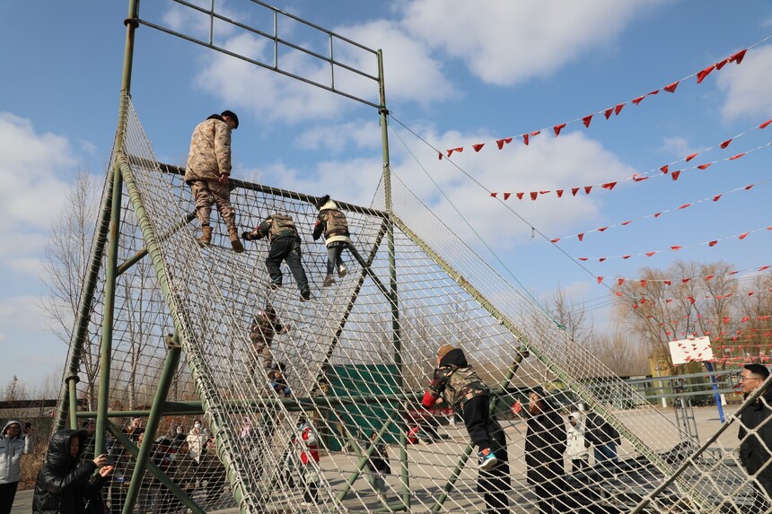 接着,研学团队乘车沿风光秀丽的蒲湖抵达滨州秦台国防教育营地。在庄严的开营仪式上,在雄壮高昂的国歌声中,全体人员肃立致敬、高唱国歌,爱国情怀深深激荡。军事技能训练中,孩子们认真研习基础动作,在勇攀高峰挑战中真切体会红军长征的艰辛与坚韧不拔的精神,CS真人射击、模拟射击项目中,他们分组协作、勇敢冲锋,在欢乐与热血中感悟军人的勇敢担当,而教官手把手传授心肺复苏、止血包扎等安全技能的场景,更让温暖与安心萦绕现场。活动尾声,10位儿童代表怀着感恩之心向爱心企业献上锦旗,稚嫩的举动满含真诚,槿秀坊智慧康养服务中心负责人刘小杰女士为表现突出的儿童颁发荣誉证书和奖章,爱心企业也为每位孩子送上精心准备的礼品,红色精神的滋养与爱心人士的关怀交织,让整个研学过程充满感人力量。